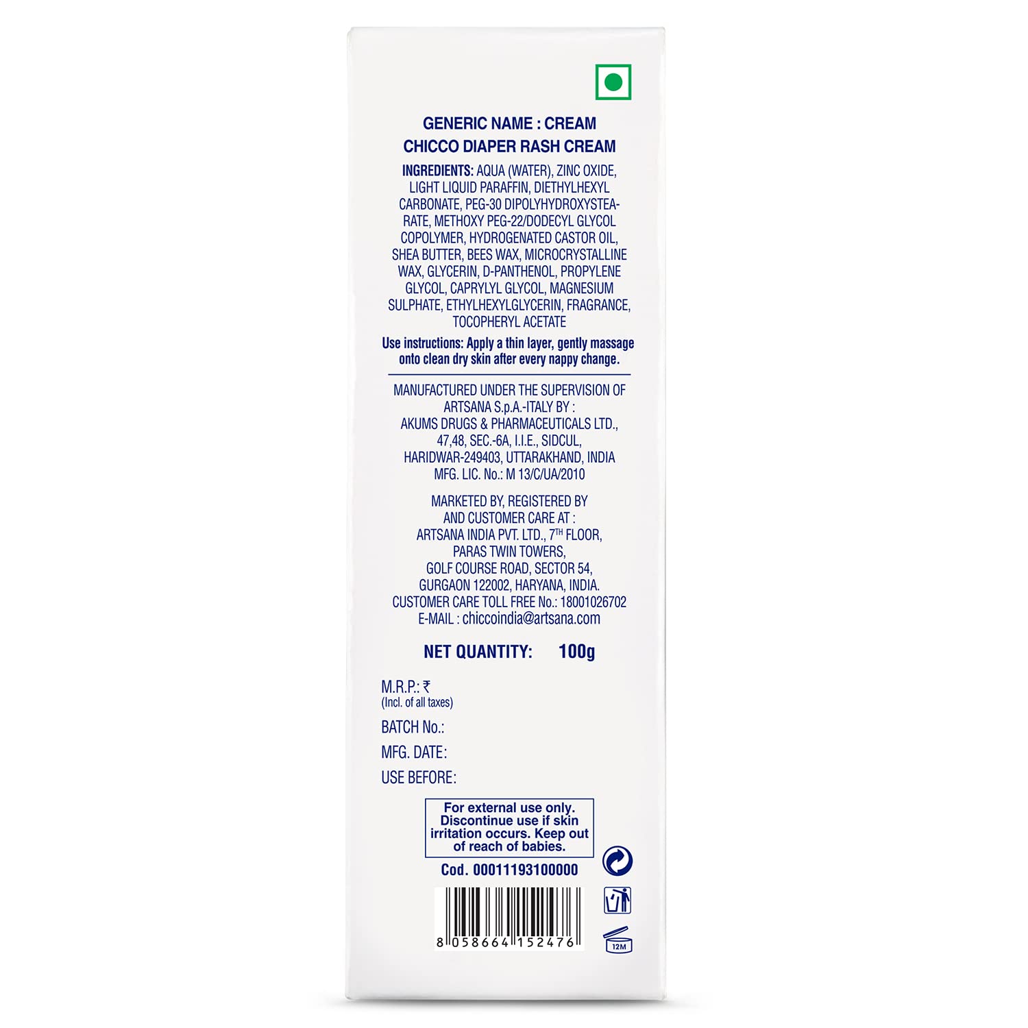 To protect and preserve the natural softness and delicacy of a baby’s skin amidst constant nappy change and cleansing can be really difficult for any parent. Our New Baby Moments Diaper Rash Cream has an Advanced formula that does not contain Phenoxyethanol & Parabens. Moreover, it is also free from other harmful toxins & preservatives like Tropolone, Mineral oil, Dyes, Alcohol, Phthalates, and EDTA, which can adversely impact the baby’s delicate skin. The new Chicco Baby Moments Diaper Rash Cream protects, soothes, and heals baby’s skin while keeping it moisturized. Its protective formula helps reduce irritation, redness, and rashes to keep baby’s skin healthy and soft. With the goodness of ingredients like Zinc Oxide and Panthenol (also known as Pro-Vitamin B5), the cream creates a protective breathable layer on baby’s skin that prevents the rash formation and promotes skin regeneration, thus making it even ‘Better’ for newborns. At Chicco, we make every effort through our scientific knowledge and global experience of more than 60 years to give the ideal care for babies, because we, like parents, believe that babies deserve the best.