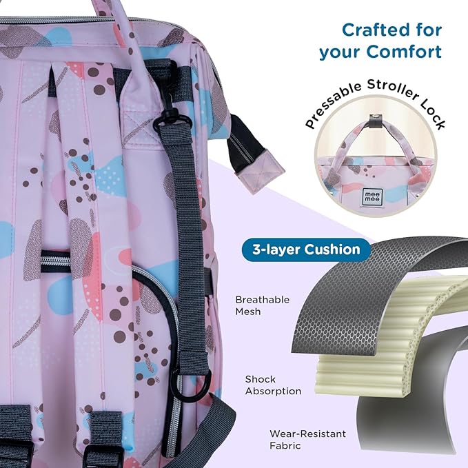 Parenting becomes effortless and stylish with the Mee Mee Cuddle Carry Diaper Bag Backpack. It is thoughtfully designed to keep every baby essential organized while giving parents unmatched comfort and convenience. With a 20L capacity and 14 multi-functional pockets, this diaper bag stores everything from diapers, wipes, and bottles to toys and personal essentials. Insulated bottle pockets maintain milk and food temperature for up to 4 hours, making feeding on the go simple and stress-free. Crafted from premium Oxford fabric, it is water-resistant, wear-resistant, and easy to clean, ensuring durability through every adventure. Smart storage features include a side tissue pocket, umbrella and bottle holders, and an anti-theft back compartment for valuables. Parents stay comfortable with cushioned, breathable, sweat-proof straps that evenly distribute weight. Tote handles and stroller hooks add versatile carrying options, while the unisex design makes it ideal for both moms and dads. Every detail is designed with care, from reinforced stitching to smooth zippers and premium finishes, reflecting quality you can trust. The Cuddle Carry Bag is more than a diaper bag. It doubles as a travel backpack, stylish tote, or daily carryall, making it useful long after the diaper years.