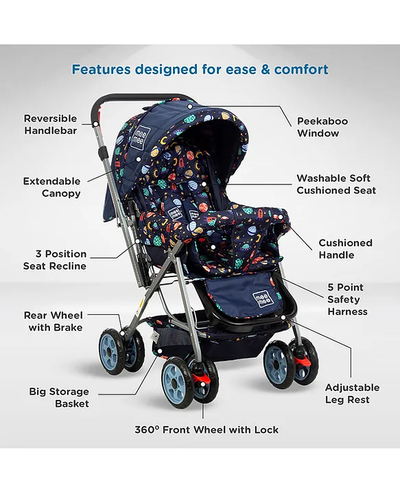 Comfort Ensured : 3 position Seat recline sothat baby can sit, relax or sleep inside the stroller. Cushioned seat,Adjustable footrest & Wheel Suspension adds to baby's comfort.