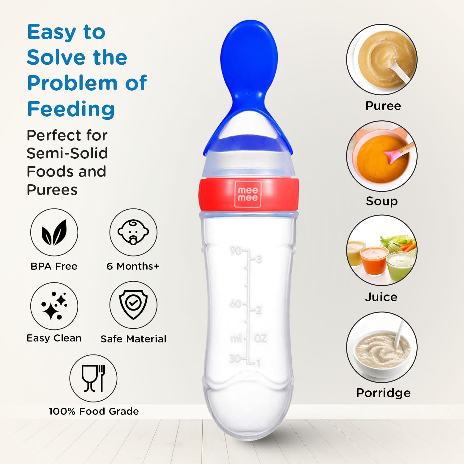 Mee Mee Squeezy Silicone Spoon Food Feeder for Babies of 6 to12 Months with in-Built Stand | BPA Free Material with Food Grade Silicone Tip (Red)